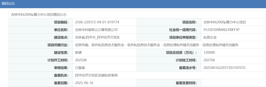 吉林中科2000p算力中心项目选址吉林省四平市四平经济开发区,总投资120000万元,主要建设具有2000P算力中心,智算中心将购置算力机柜(25kW)160-256台、存储机柜(12kW)31台、测试机房测试机柜(25kW)5台,以及256台智算服务器和相关存储及组网等配套设备。项目计划于2025年8月开工,于2027年6月竣工。