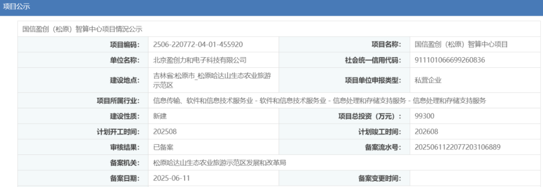 ]article_adlist-->国信盈创(松原)智算中心项目选址吉林省松原市松原哈达山生态农业旅游示范区,总投资99300万元,拟新购土地45亩,建设核心筒钢框架结构建筑6000平方米,安装315个机架提供2000PFLOPS@FP16计算能力,采取风力发电、余热回收等技术,配置1040台(8320卡)壁仞BR104系列高性能训练服务器,设计PUE小于1.15、单机架功率6~45KW,满足数据中心A级标准,成为支持千亿参数模型的大规模训推一体化智算平台。项目计划于2025年8月开工,于2026年8月竣工。