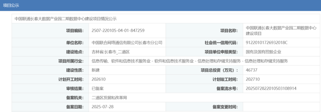 中国联合网络通信有限公司长春市分公司《中国联通长春大数据产业园二期数据中心建设项目》的备案办理结果线下股票配资。